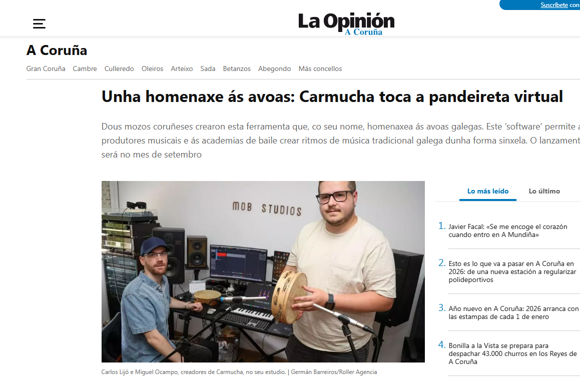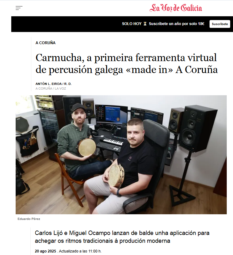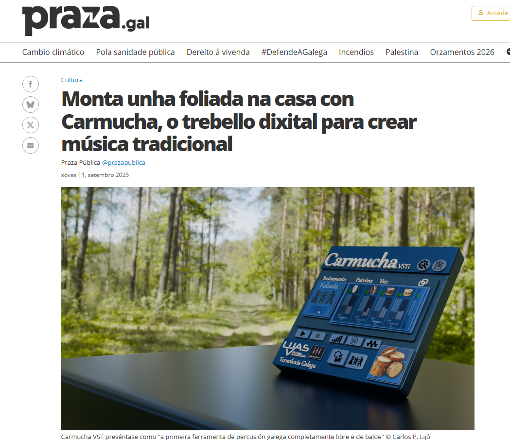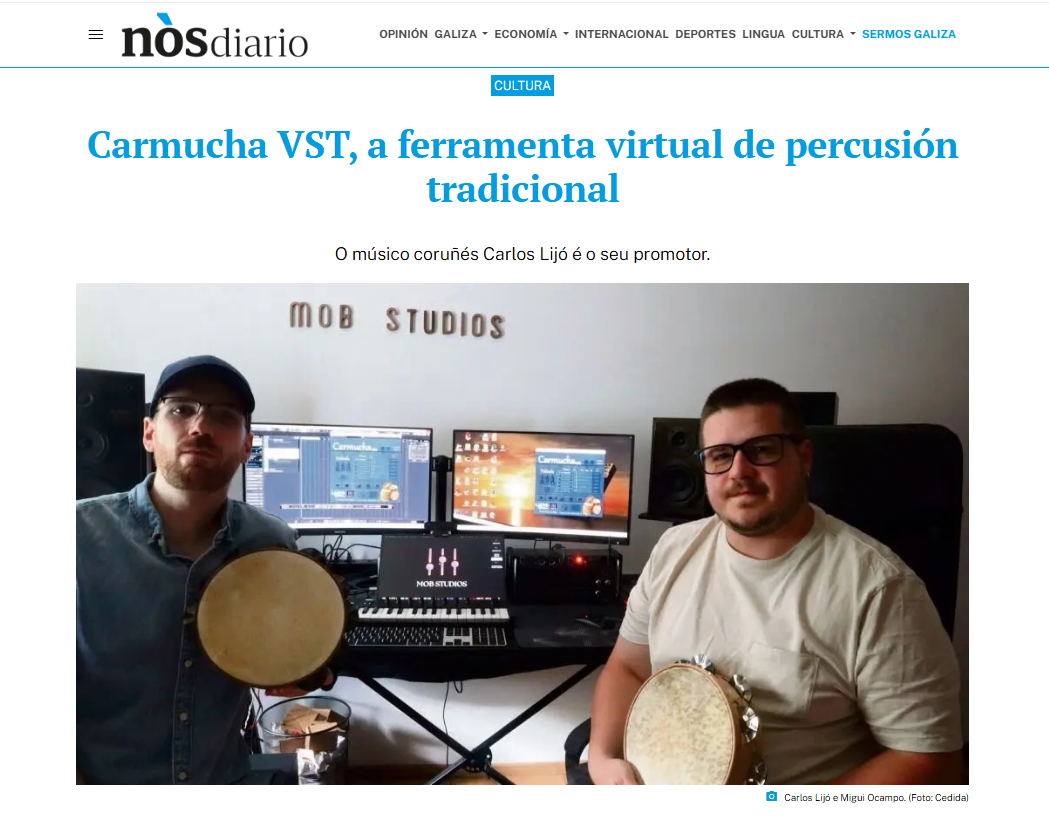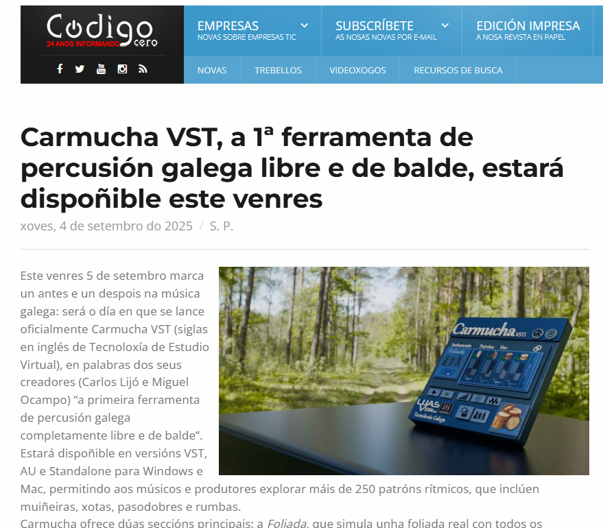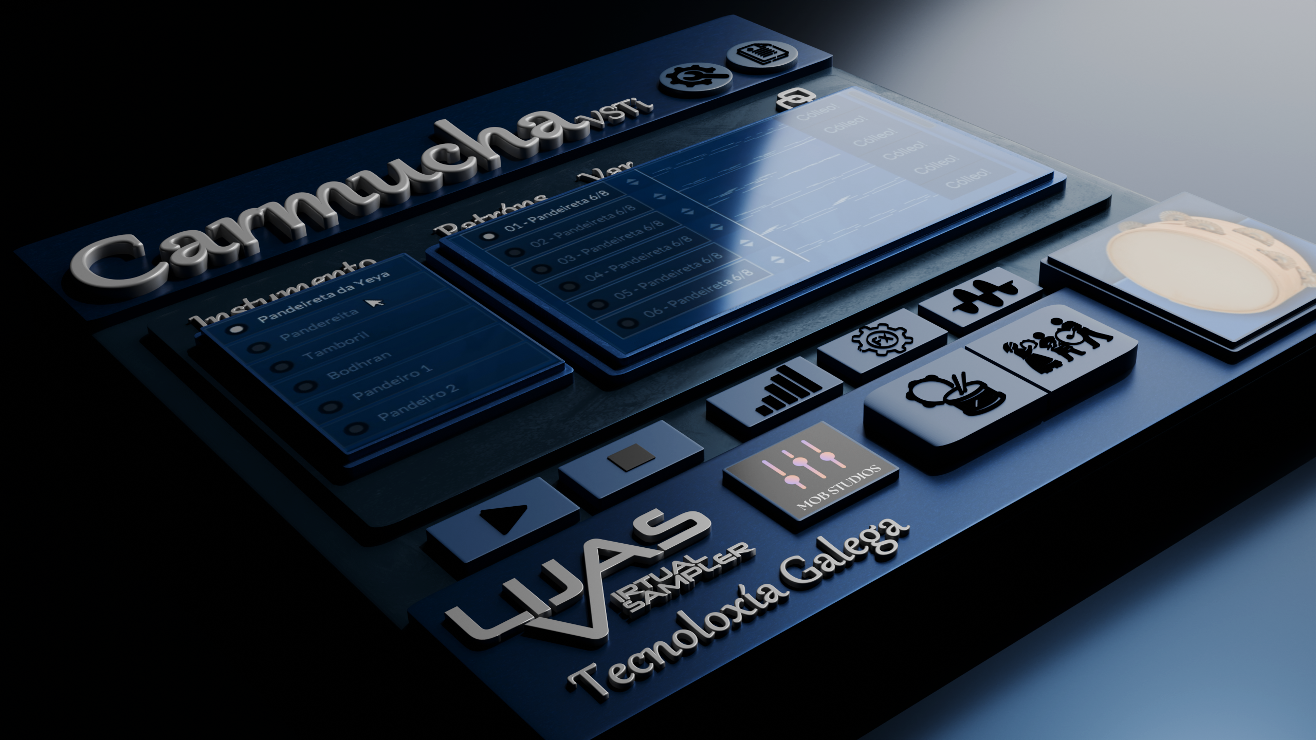 Carmucha VST 茅 a primeira ferramenta de percusi贸n galega libre, accesible e de balde. Ofrece d煤as versi贸ns: versi贸n VST para produci贸ns musicais en DAW e versi贸n Standalone para escritorio.